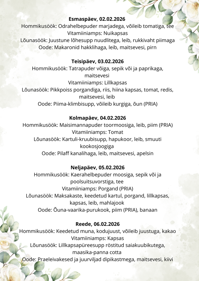 Teavet toidus leiduvate allergeenide kohta saab toidu valmistajalt või majandusjuhatajalt läbi eliisi, otse suhtlusel või tel. 7964735.