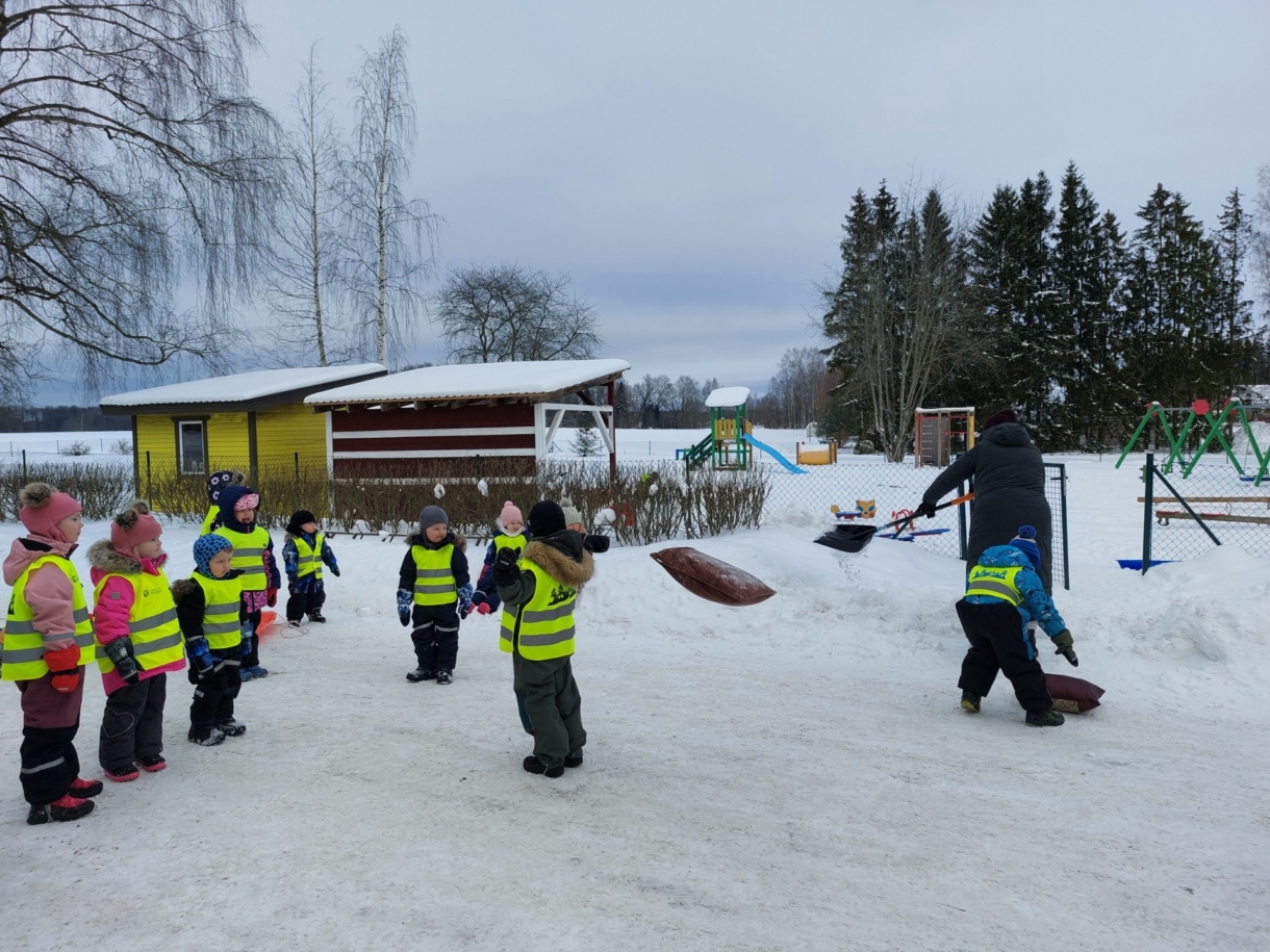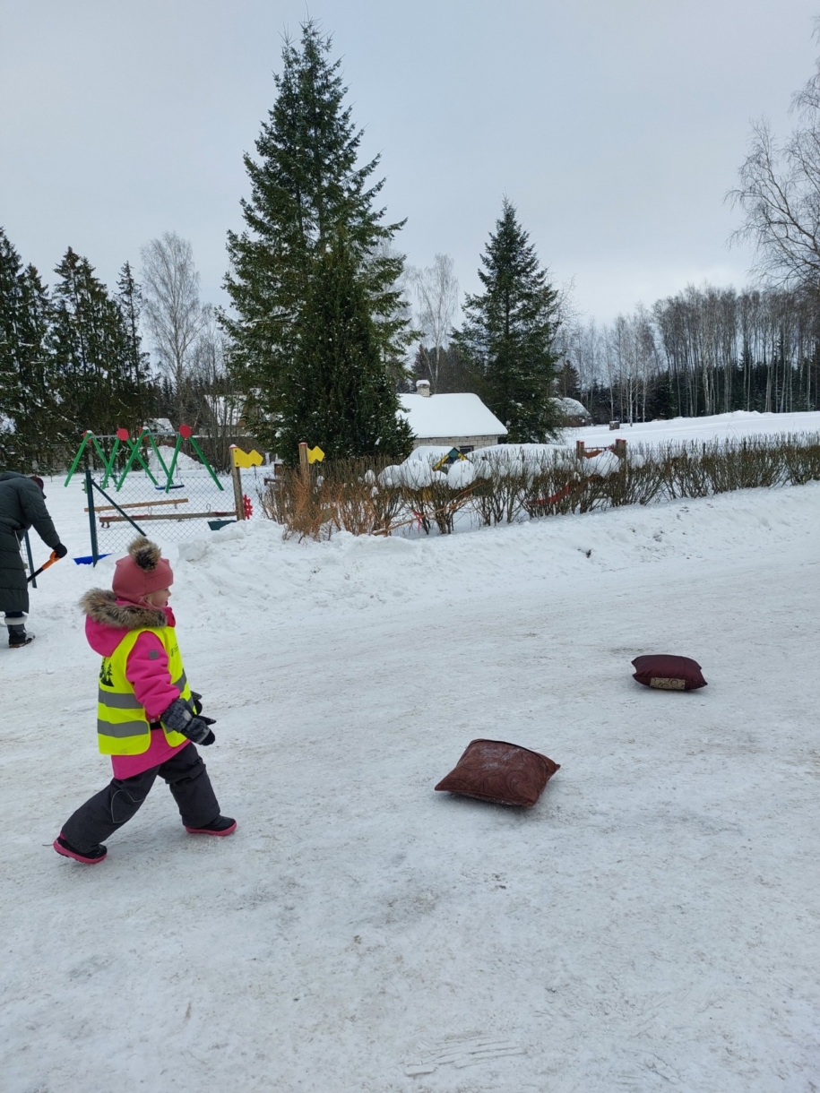 Õues tähistasime vastlapäeva mängudega: kelguvedamismäng; padjaviskemäng; pikima vastlaliu võistlus.