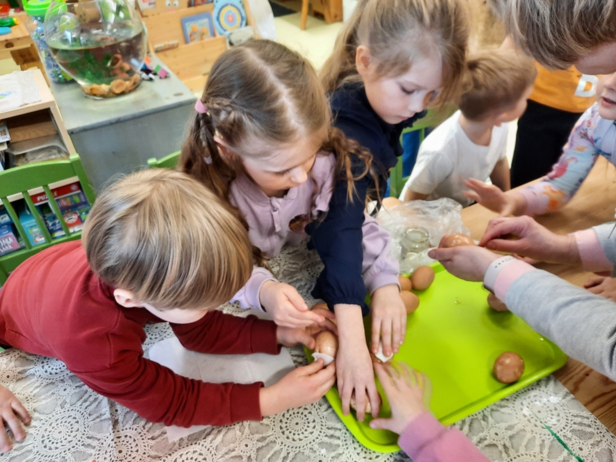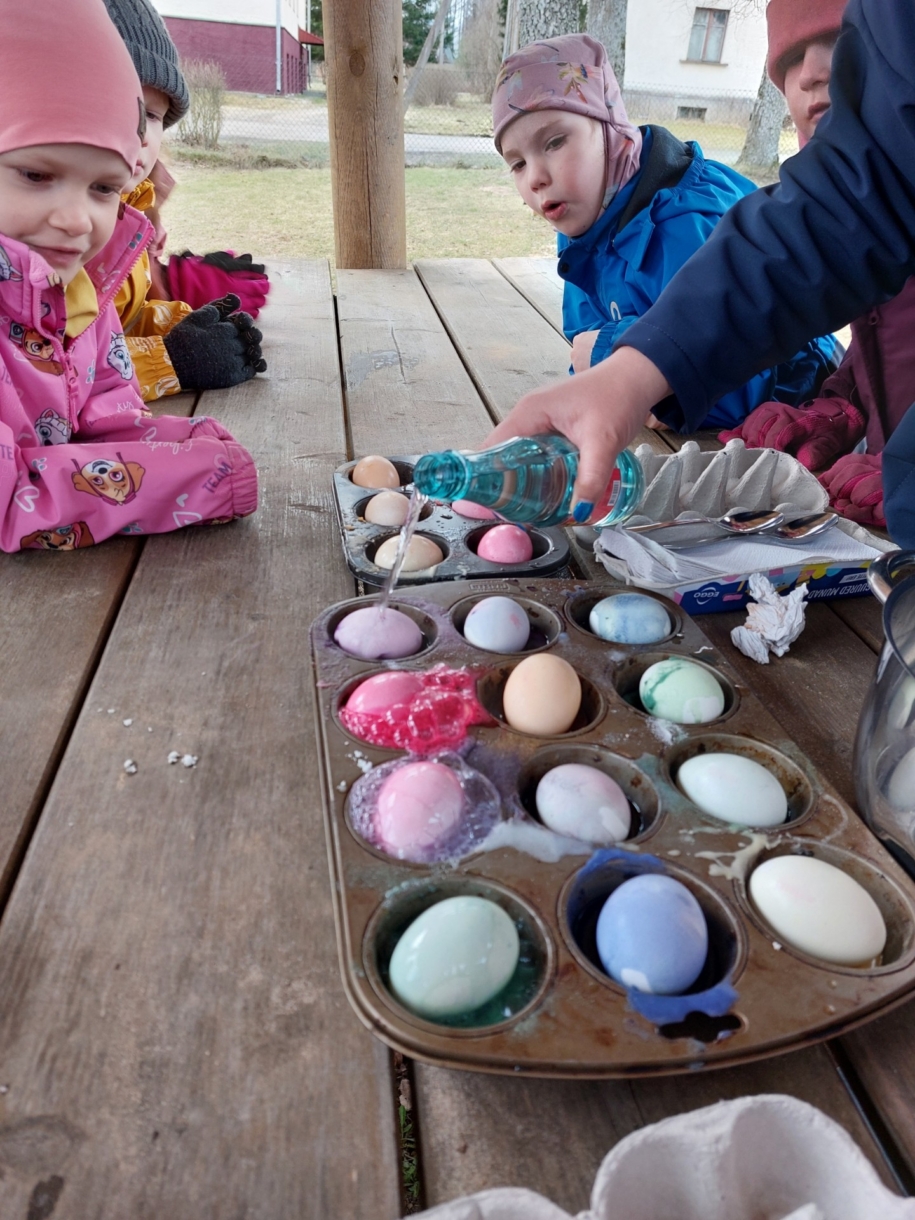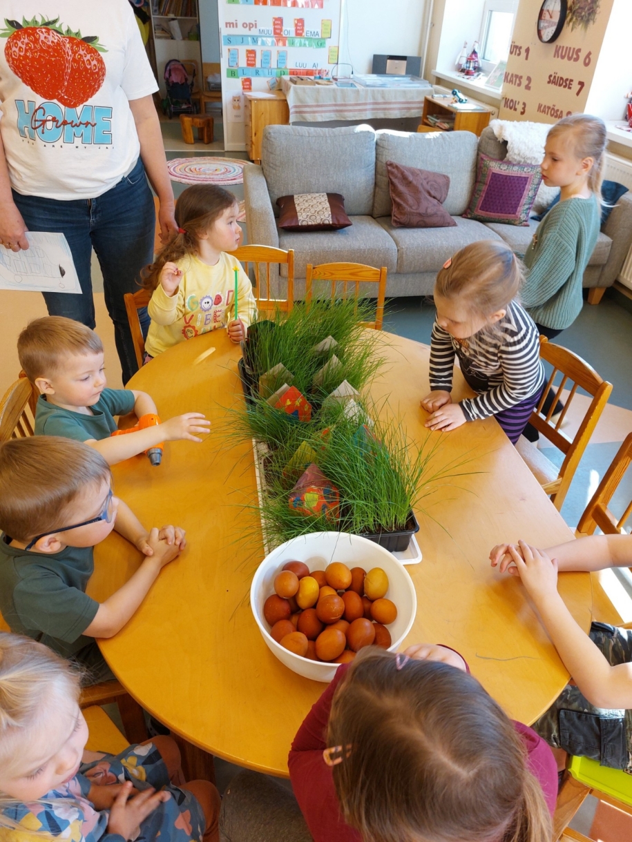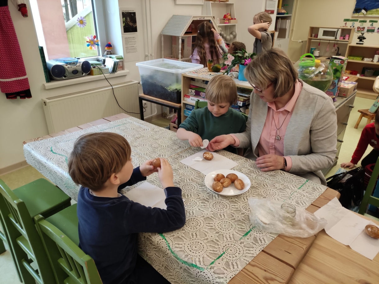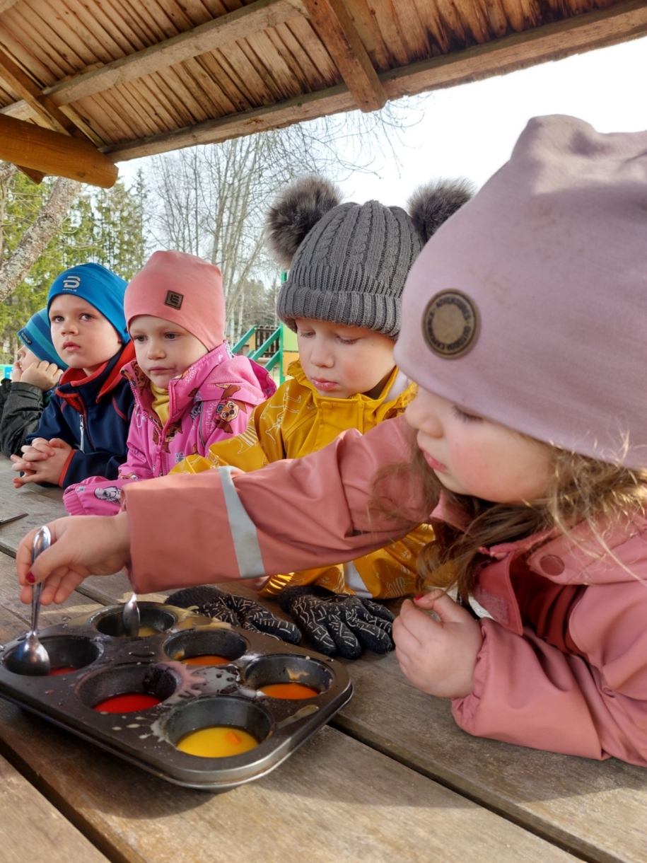 Eriliselt põnev oli sibulakoortega munade värvimine. Pühadenädalal toimus ka õppekäik Kaja koju kanu vaatama. Toideti kanu, tehti neile pai ning viidi lasteaias kasvatatud muru kanadele külakostiks ja rõõmsaks nokkimiseks. Õues viis õpetaja Katrin läbi lõbusa katse munade, värvide ja soodaga. Kõik lapsed said ise mune värvida ning katses aktiivselt osaleda. Nädal oli täis elevust, pärimust ja vahvaid avastusi!