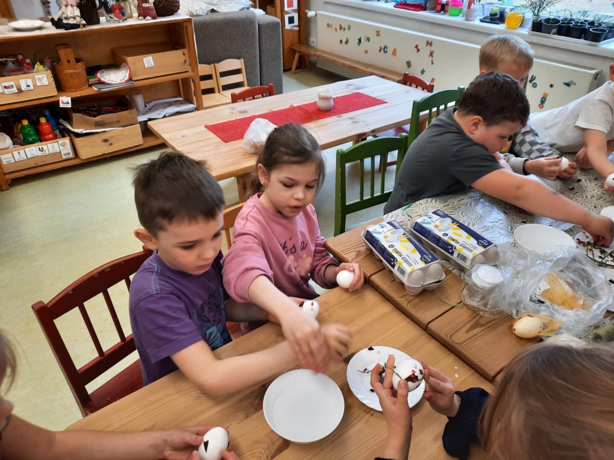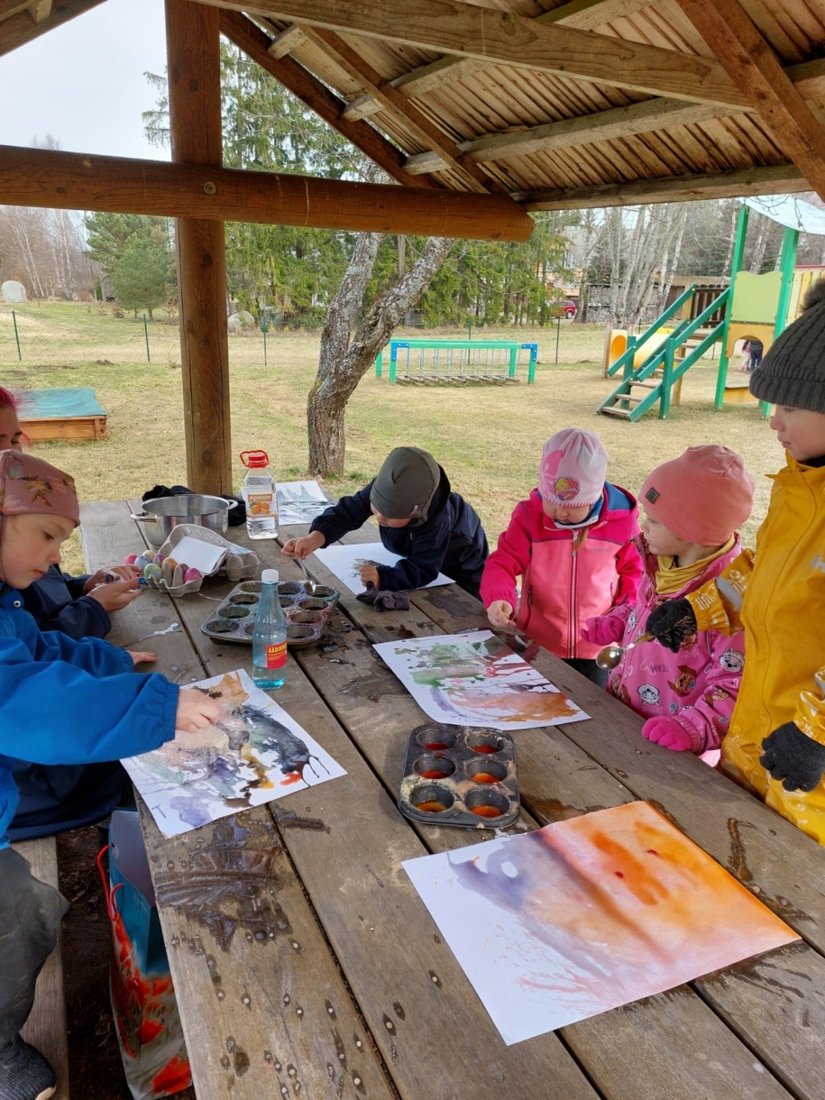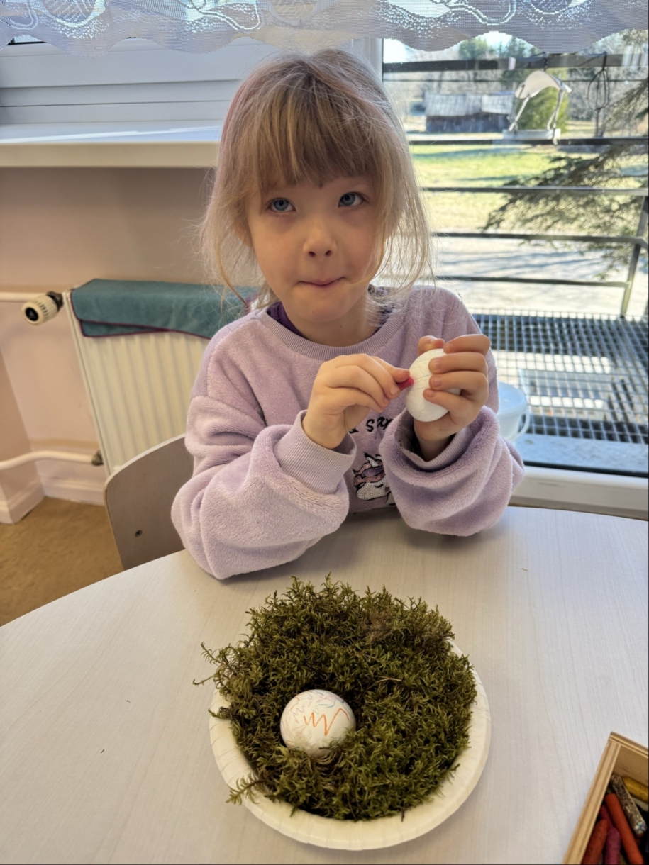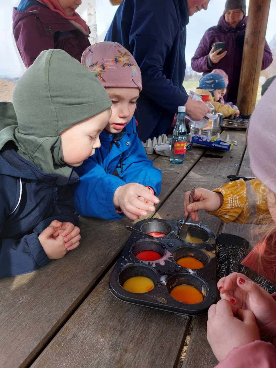 Obinitsas värviti koos lastega mune rasvakriitidega, mis pakkus palju loovust ja avastamisrõõmu. Lisaks valmistati munade jaoks vahva pesa samblikest, kuhu värvilised munad said pidulikult puhkama jääda.