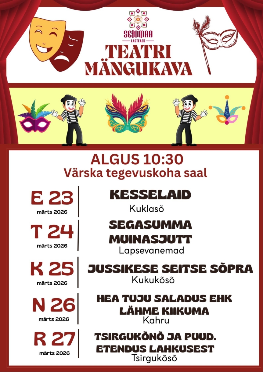 Lasteaia rühmad ja lapsevanemad esitavad toredaid etendusi. Tule ja naudi ühiselt loodud teatrirõõmu!